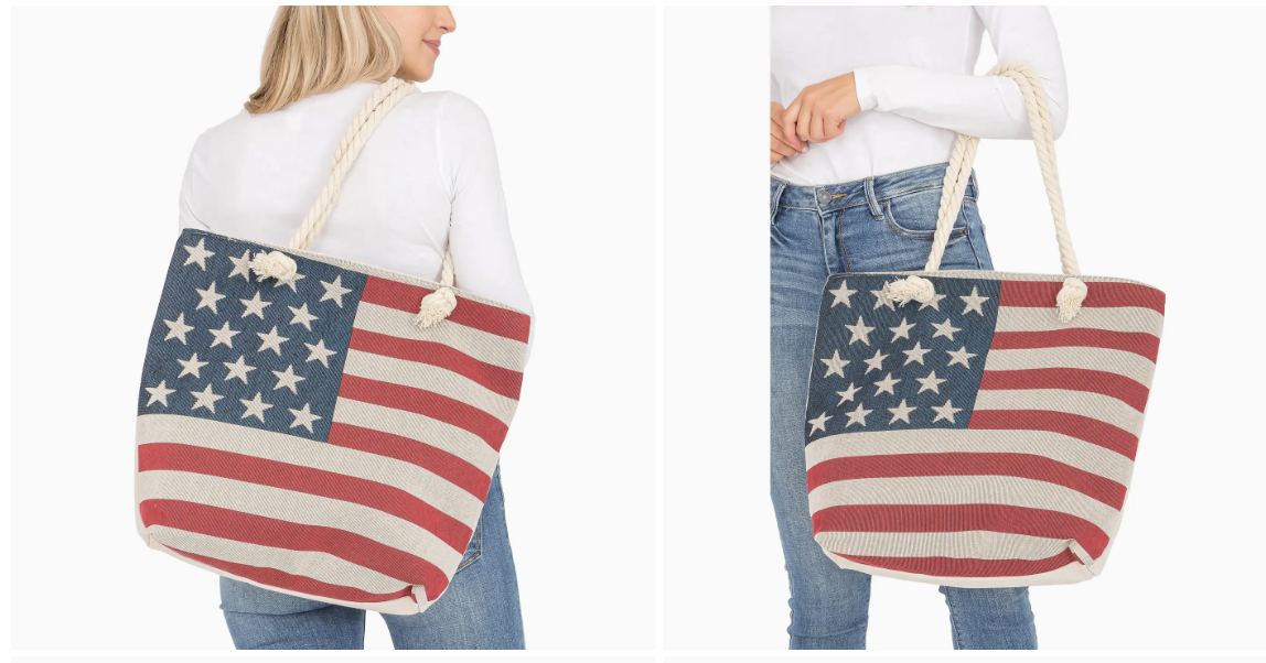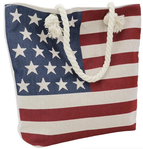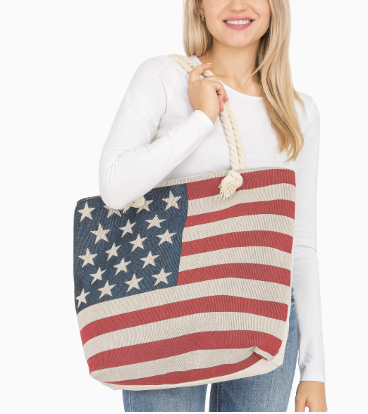 American Flag Print Woven Tapestry Rope Handle Burlap Canvas Tote Bag -NOTE: Single Side Print -Dimensions: 18″ * 16″ * 5″ -Double Top Handle: 10″ Drop -1 x Zipper Closure Polyester Fabric Lined Main Compartment -1 x Zipper Closure Inner Auxiliary Pouch -100% Canvas -CA Prop 65 Advisory -Great Patriotic Red, White, Blue Gift for…