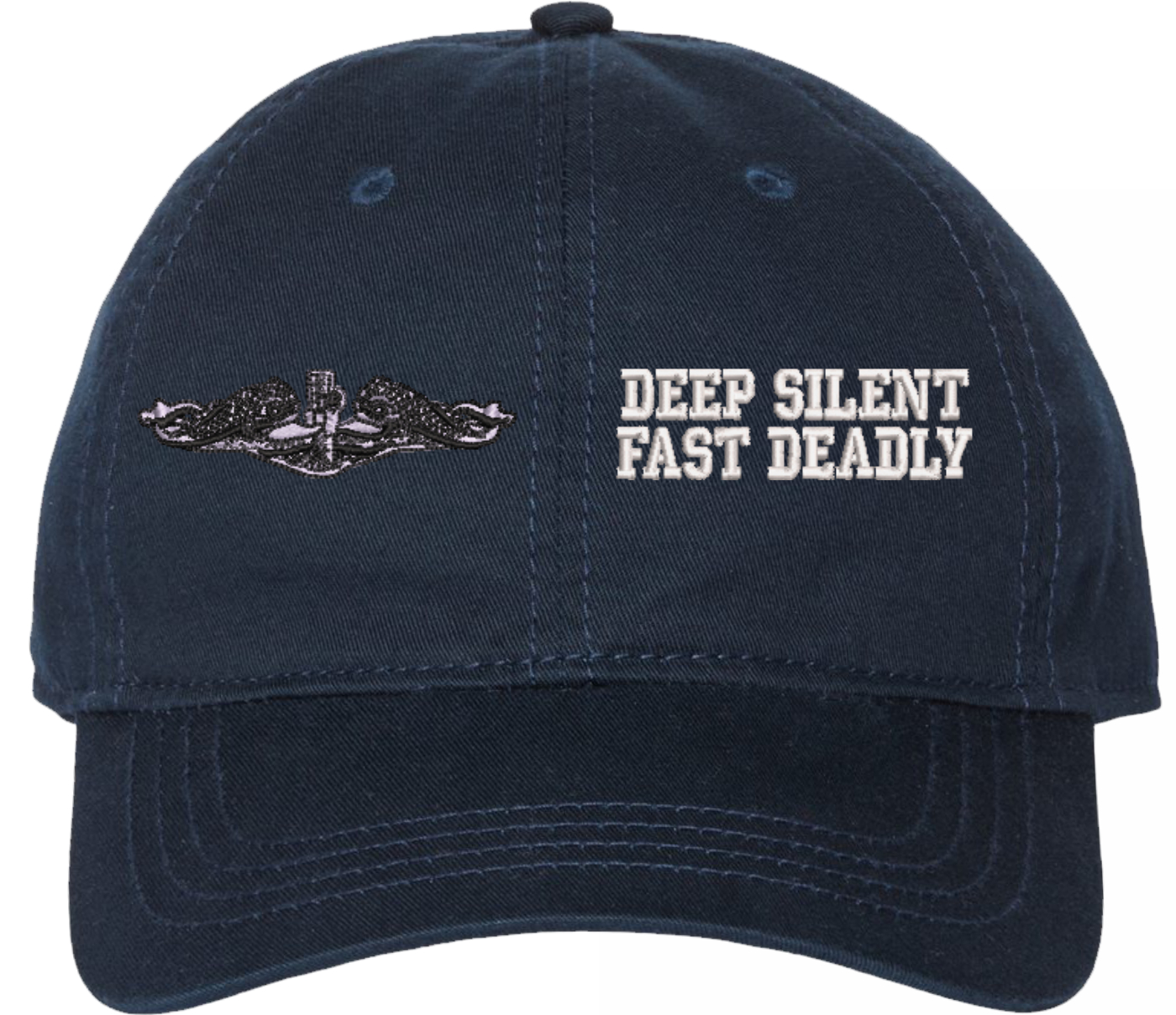 Show your Navy pride with this U.S. Navy Enlisted Silver Dolphins Deep Silent Fast Deadly Unstructured Dad Cap from MilitaryBest. Crafted from 100% washed chino twill cotton, this six-panel, low-profile cap offers a relaxed and comfortable fit. Featuring high-quality embroidery done in our Scottsboro, Alabama facility, this cap is designed with a pre-curved visor and an adjustable tri-glide buckle closure for a perfect fit. Whether for everyday wear or as a meaningful gift, this cap is a great way to honor your own or a loved one’s service. For caps ordered with custom embroidered personalized text please allow an additional 3 to 5 days production time. All custom back text will be embroidered in ALL CAPITAL LETTERS. Caps with back text or eggs are non-returnable unless there is a material defect in the cap. A percentage of the sale of each MilitaryBest item is forwarded to the licensing departments of each respective branch of service in support of the MWR (Morale, Welfare, & Recreation) program. These payments are made by either ALL4U LLC or the wholesaler from where the item originated. Our team thanks you for your service and your support of these programs. Product Features 100% washed chino twill cotton Unstructured, six-panel, low-profile design High-quality embroidery done in the USA Pre-curved visor for classic styling Adjustable tri-glide buckle closure