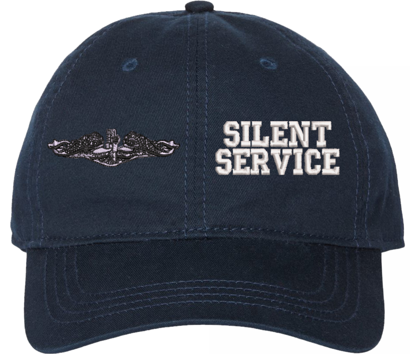 Show your Navy pride with this U.S. Navy Enlisted Silver Dolphins Silent Service Unstructured Dad Cap from MilitaryBest. Crafted from 100% washed chino twill cotton, this six-panel, low-profile cap offers a relaxed and comfortable fit. Featuring high-quality embroidery done in our Scottsboro, Alabama facility, this cap is designed with a pre-curved visor and an adjustable tri-glide buckle closure for a perfect fit. Whether for everyday wear or as a meaningful gift, this cap is a great way to honor your own or a loved one’s service. For caps ordered with custom embroidered personalized text please allow an additional 3 to 5 days production time. All custom back text will be embroidered in ALL CAPITAL LETTERS. Caps with back text or eggs are non-returnable unless there is a material defect in the cap. A percentage of the sale of each MilitaryBest item is forwarded to the licensing departments of each respective branch of service in support of the MWR (Morale, Welfare, & Recreation) program. These payments are made by either ALL4U LLC or the wholesaler from where the item originated. Our team thanks you for your service and your support of these programs. Product Features 100% washed chino twill cotton Unstructured, six-panel, low-profile design High-quality embroidery done in the USA Pre-curved visor for classic styling Adjustable tri-glide buckle closure