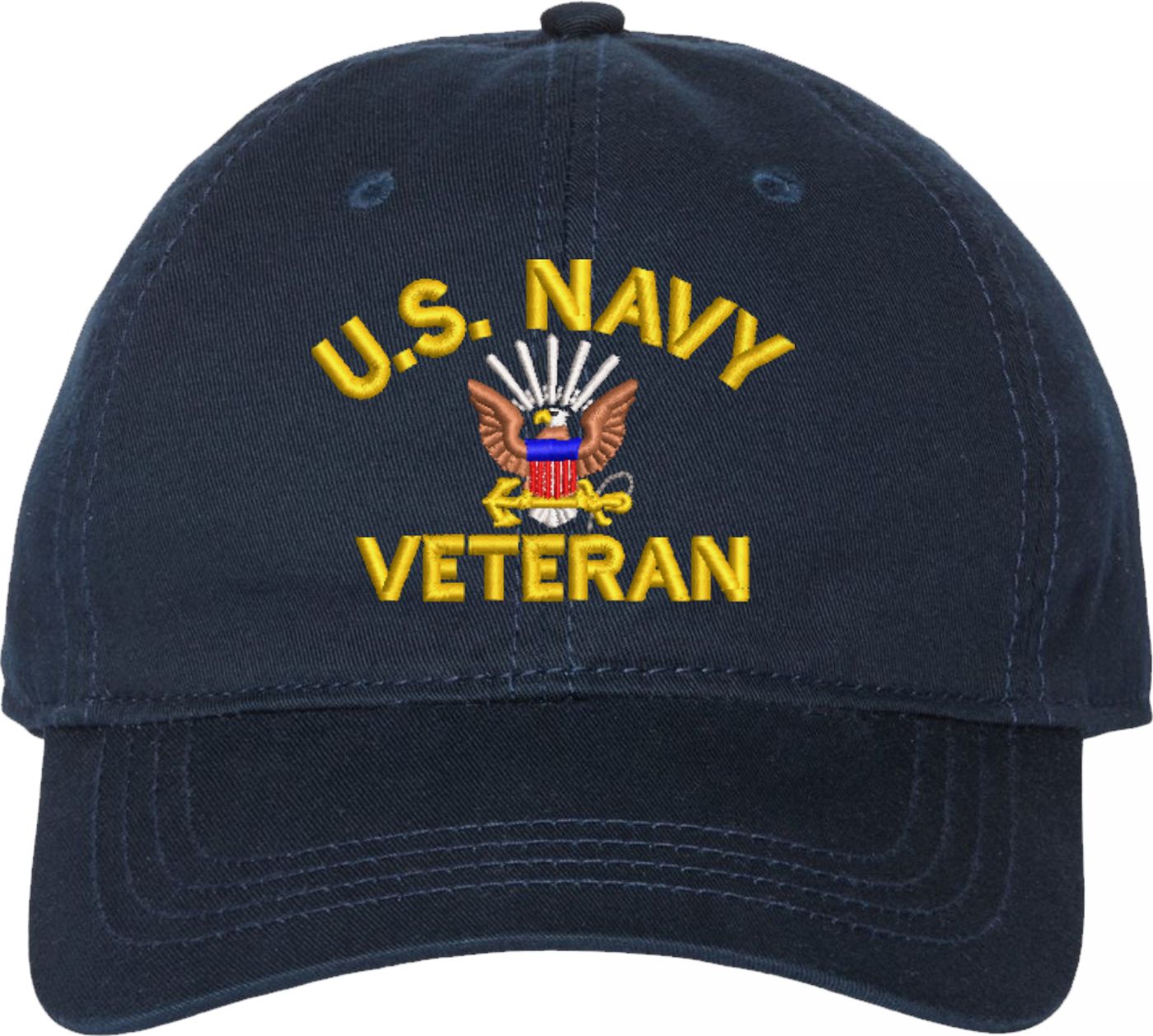 Show your Navy pride with this U.S. Navy Veteran Unstructured Dad Cap from MilitaryBest. Also known as an Old Salt Cap, This hat was crafted from 100% washed chino twill cotton, this six-panel, low-profile cap offers a relaxed and comfortable fit. Featuring high-quality embroidery done in our Scottsboro, Alabama facility, this cap is designed with a pre-curved visor and an adjustable tri-glide buckle closure for a perfect fit. Whether for everyday wear or as a meaningful gift, this cap is a great way to honor your own or a loved one’s service. For caps ordered with custom embroidered personalized text please allow an additional 3 to 5 days production time. All custom back text will be embroidered in ALL CAPITAL LETTERS. Caps with back text or eggs are non-returnable unless there is a material defect in the cap. A percentage of the sale of each MilitaryBest item is forwarded to the licensing departments of each respective branch of service in support of the MWR (Morale, Welfare, & Recreation) program. These payments are made by either ALL4U LLC or the wholesaler from where the item originated. Our team thanks you for your service and your support of these programs. Product Features 100% washed chino twill cotton Unstructured, six-panel, low-profile design High-quality embroidery done in the USA Pre-curved visor for classic styling Adjustable tri-glide buckle closure