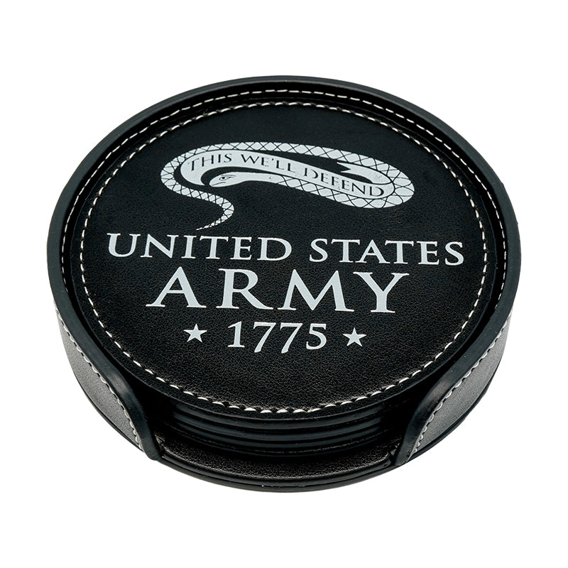 ► US ARMY COASTER – Round shaped US Army Coaster PU leather coaster set. White stitching around the edge makes a perfect accent and the US Army slogan “This We’ll Defend” hot stamped and embossed into the coaster to remain sharp and crisp. Makes a great gift to any military veteran or active duty service member.