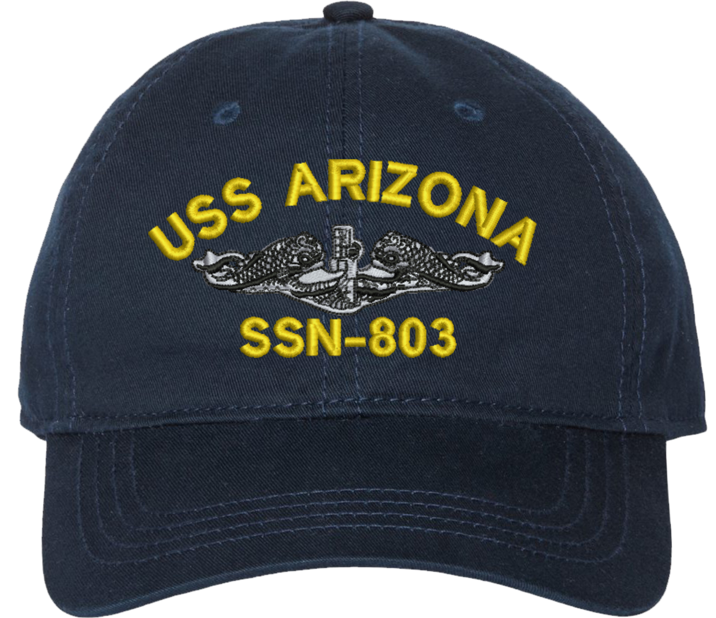 Show your Navy pride with this USS Arizona SSN-803 with Dolphins Unstructured Dad Cap from MilitaryBest. Crafted from 100% washed chino twill cotton, this six-panel, low-profile cap offers a relaxed and comfortable fit. Featuring high-quality embroidery done in our Scottsboro, Alabama facility, this cap is designed with a pre-curved visor and an adjustable tri-glide buckle closure for a perfect fit. Whether for everyday wear or as a meaningful gift, this cap is a great way to honor your own or a loved one’s service. For caps ordered with custom embroidered personalized text please allow an additional 3 to 5 days production time. All custom back text will be embroidered in ALL CAPITAL LETTERS. Caps with back text or eggs are non-returnable unless there is a material defect in the cap. A percentage of the sale of each MilitaryBest item is forwarded to the licensing departments of each respective branch of service in support of the MWR (Morale, Welfare, & Recreation) program. These payments are made by either ALL4U LLC or the wholesaler from where the item originated. Our team thanks you for your service and your support of these programs. Product Features 100% washed chino twill cotton Unstructured, six-panel, low-profile design High-quality embroidery done in the USA Pre-curved visor for classic styling Adjustable tri-glide buckle closure