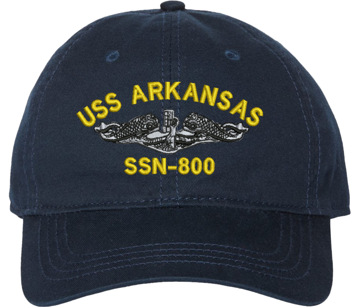 Show your Navy pride with this USS Arkansas SSN-800 with Dolphins Unstructured Dad Cap from MilitaryBest. Crafted from 100% washed chino twill cotton, this six-panel, low-profile cap offers a relaxed and comfortable fit. Featuring high-quality embroidery done in our Scottsboro, Alabama facility, this cap is designed with a pre-curved visor and an adjustable tri-glide buckle closure for a perfect fit. Whether for everyday wear or as a meaningful gift, this cap is a great way to honor your own or a loved one’s service. For caps ordered with custom embroidered personalized text please allow an additional 3 to 5 days production time. All custom back text will be embroidered in ALL CAPITAL LETTERS. Caps with back text or eggs are non-returnable unless there is a material defect in the cap. A percentage of the sale of each MilitaryBest item is forwarded to the licensing departments of each respective branch of service in support of the MWR (Morale, Welfare, & Recreation) program. These payments are made by either ALL4U LLC or the wholesaler from where the item originated. Our team thanks you for your service and your support of these programs. Product Features 100% washed chino twill cotton Unstructured, six-panel, low-profile design High-quality embroidery done in the USA Pre-curved visor for classic styling Adjustable tri-glide buckle closure